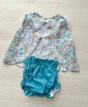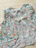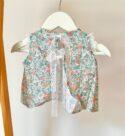 Blusa flores menta 100% algodón orgánico con lazadas en la espalda y volantitos en puntilla blanca.