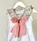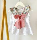Blusa plumeti blanca con volantes en liberty Porcelana y lazada rosa.