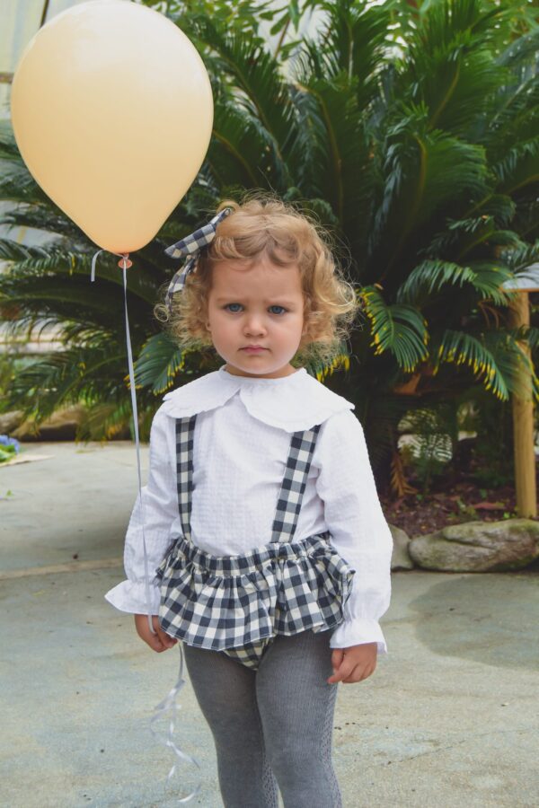Braguita volante vichy negra con tirantes ajustables y lazo en la parte de detrás. Composición 100% algodón