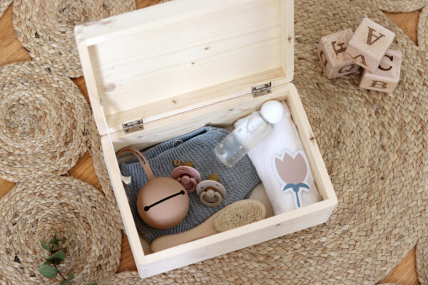 Para guardar su primera puesta, su cordón umbilical, un mechoncito de su pelito de bebé, vuestras pulseras del hospital… ¡Llena esta cajita de preciosos recuerdos!