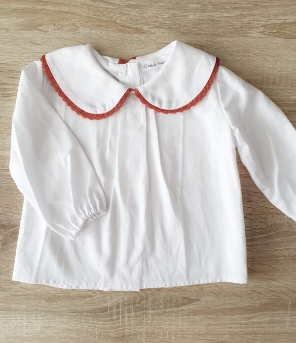 Camisa blanca 100% algodón con cuello redondo y remate en pana color terracota.
