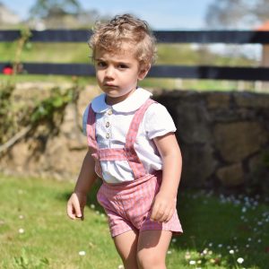 Camisa vichy blanca con cuello redondo y botoncitos de madera.