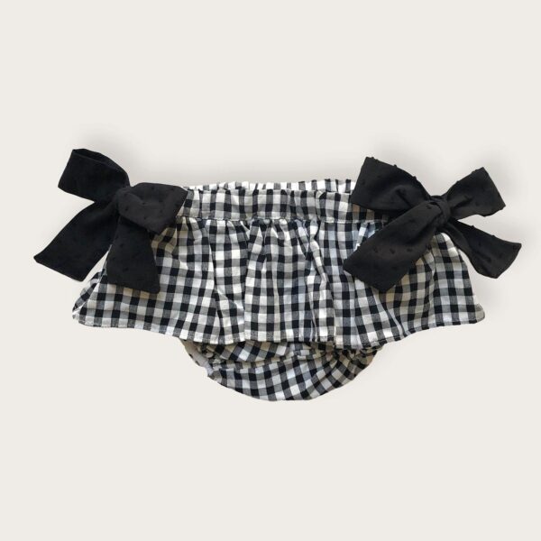 -Braguita vichy blanco y negro con lacitos laterales en plumeti negro. Forrada en su interior y 100% algodón.