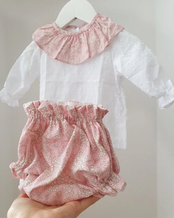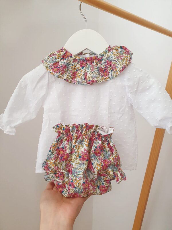Conjunto blusa plumeti blanca cuello volante en liberty + culotte forrado 100% algodón.