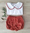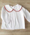 -Camisa blanca 100% algodón con cuello redondo y remate en pana color terracota.