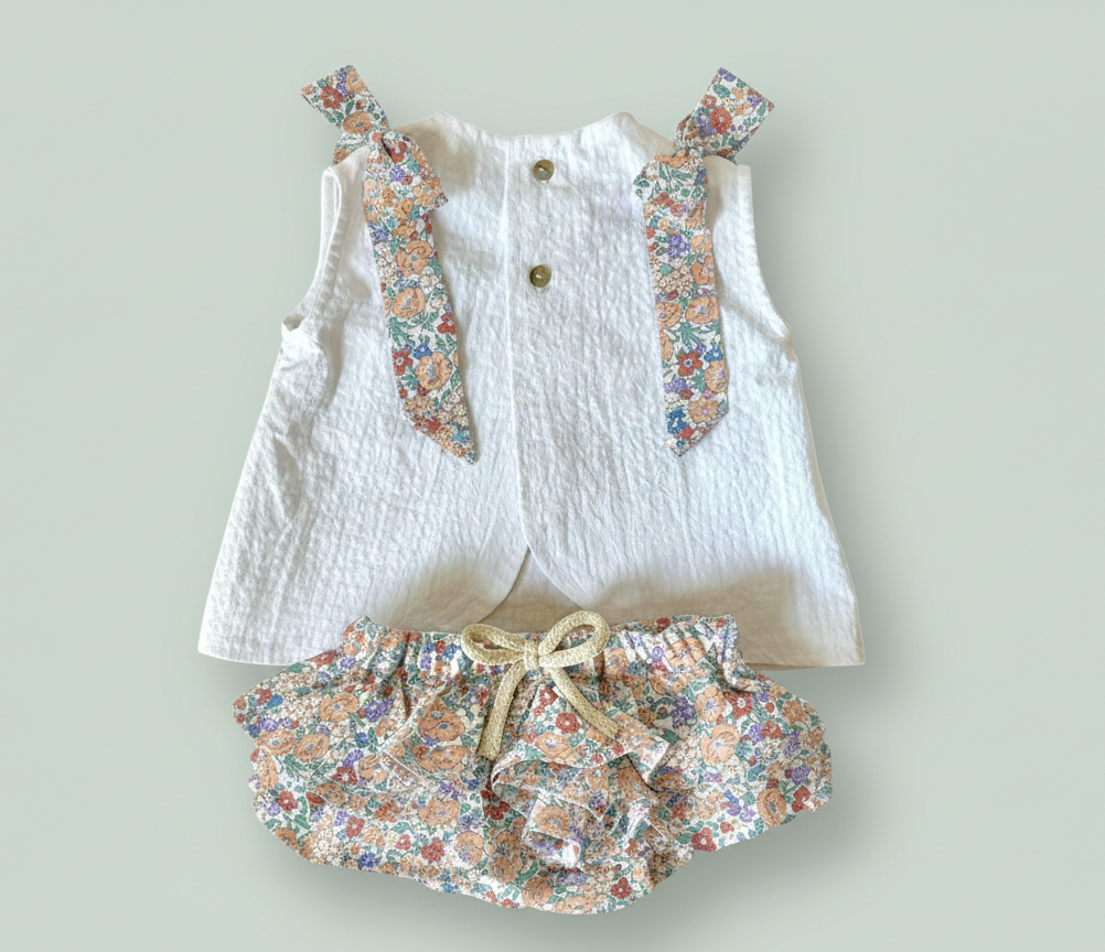 Conjunto de blusa en vichy blanco con lacitos estampados y espalda abierta
