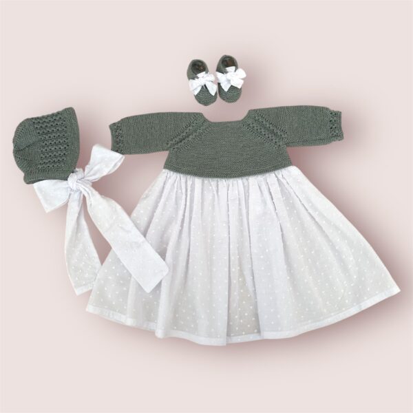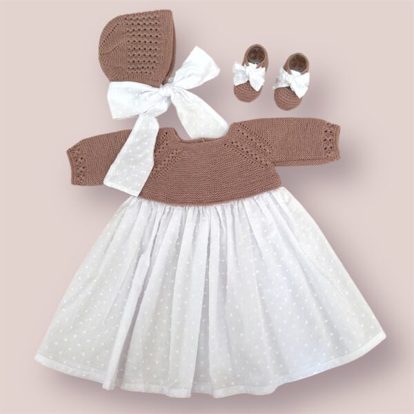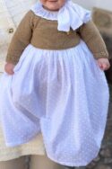 Faldón 100% lana merino de máxima calidad tejido a mano con caída en plumeti blanco.