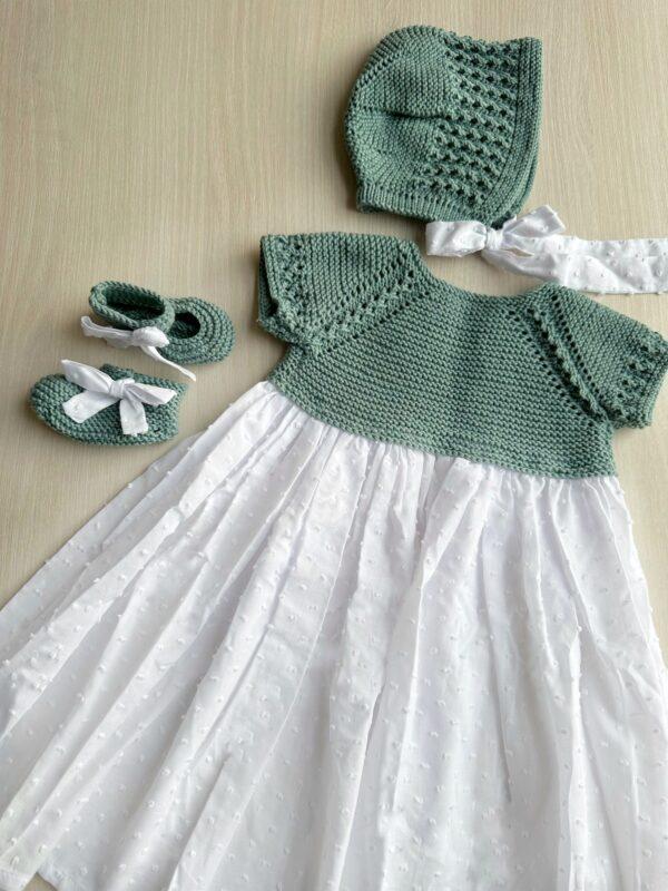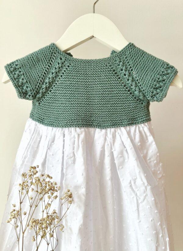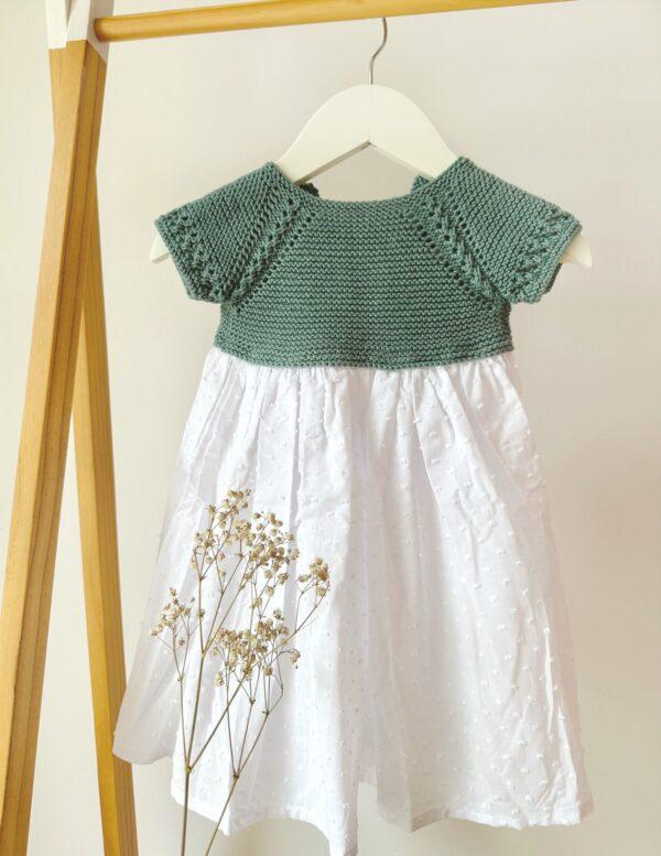 Faldón con cuerpo de punto de algodón tejido a mano y caída en plumeti blanco.