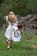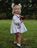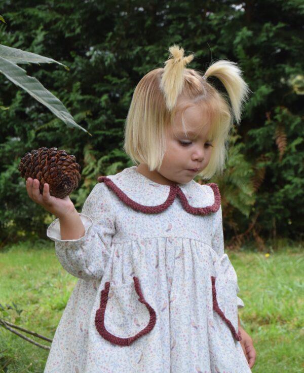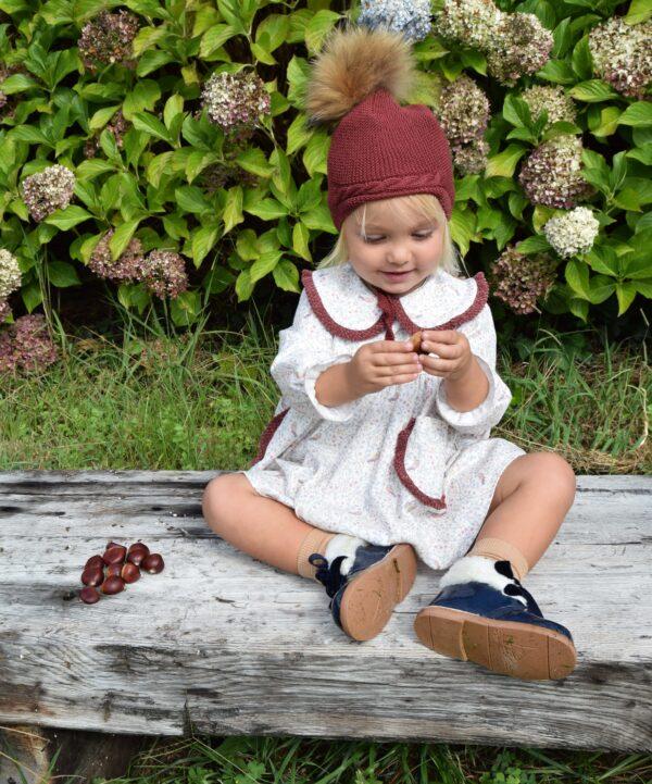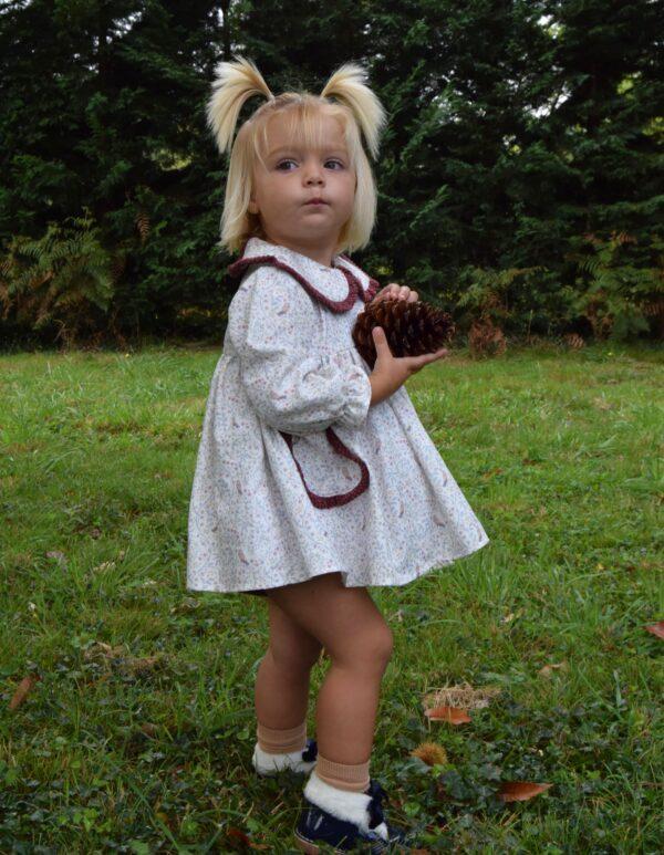 Jesusito estampado de búhos y florecitas con volantito de pana en el cuello y bolsillos.