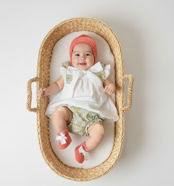 -Patucos de punto coral tejidos a mano con lacito en plumeti blanco