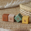 Los cubos son de madera de haya maciza, miden aproximadamente 65 × 65 mm y están pintados a mano con materiales sin tóxicos.