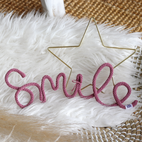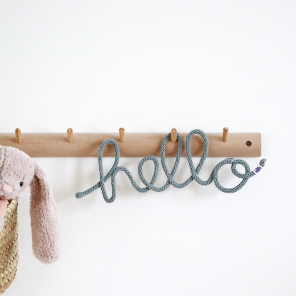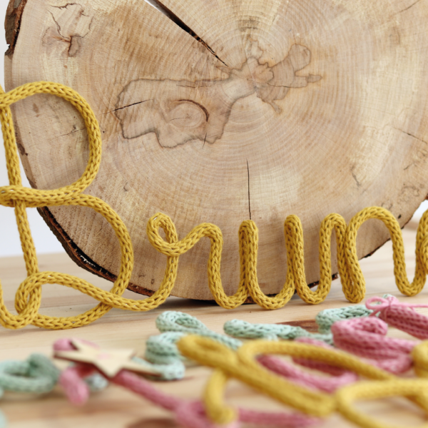 Puedes colocar tu nombre tejido de dos formas: colgado en la pared con clavos pequeños o cinta de doble cara o apoyado en algún mueble o estantería. ¡PERO CUIDADO! Si tu nombre incluye letras como la «f», «g», «j», «p», «q», «e» o la «y» no podrán apoyarse rectos debido a su forma.