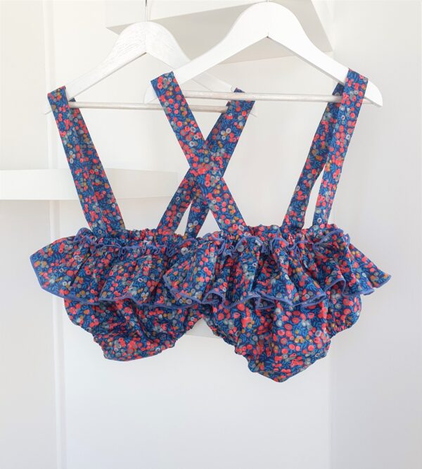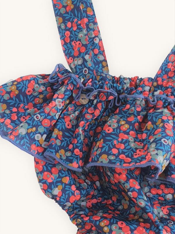 Braguita volante con tirantes en Liberty Nausicaa 100% algodón. Un estampado precioso para esta temporada y que combina con muchos colores. Se pueden ajustar los tirantes moviendo el botón.