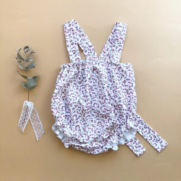 Ranita Olivia, una ranita de florecitas en tonos rosas, lilas y verdes de algodón 100% y forro de algodón orgánico, tirantes ajustables que crecen con los peques, que más se le puede pedir! Hecha a mano en Galicia.