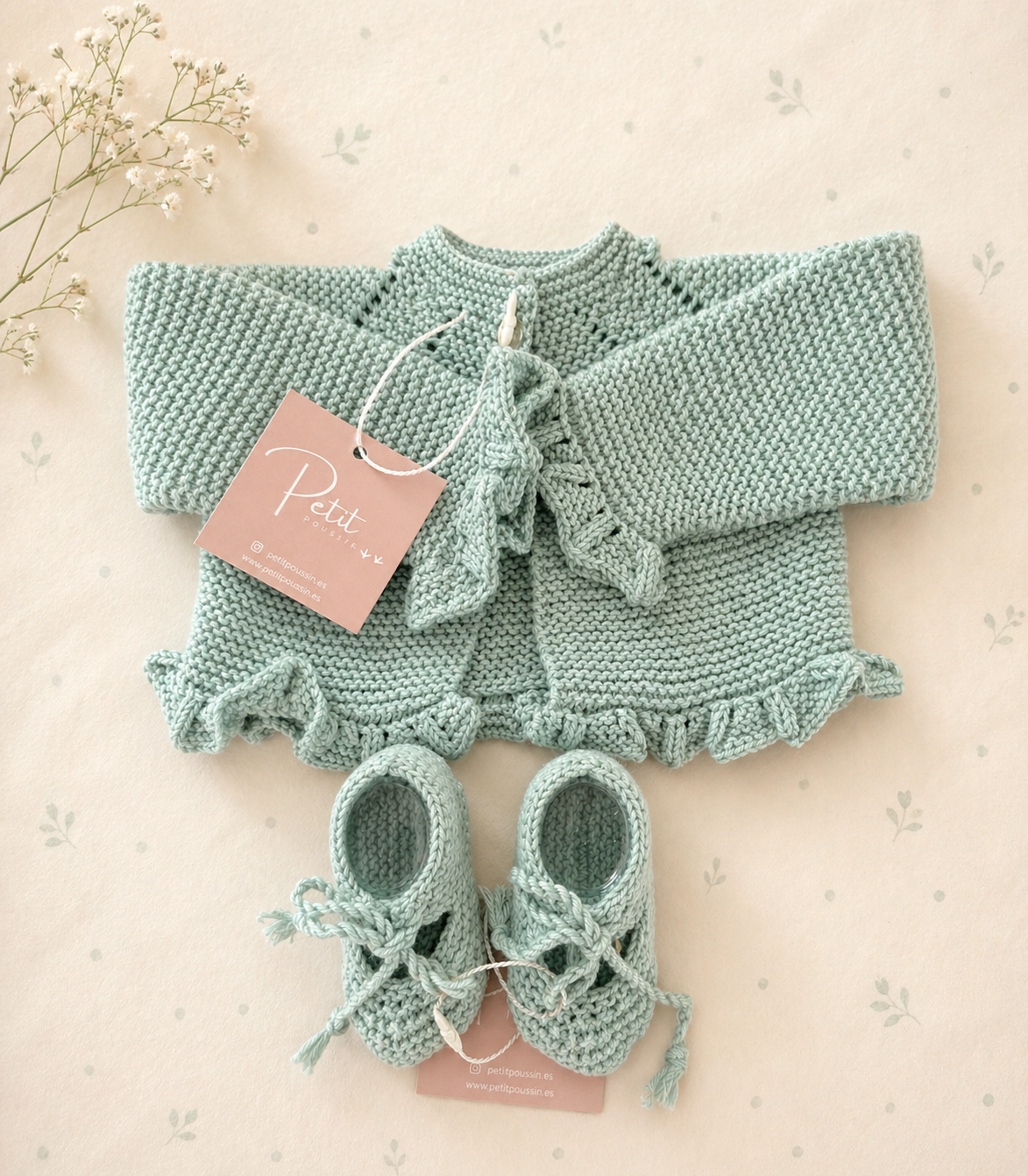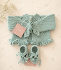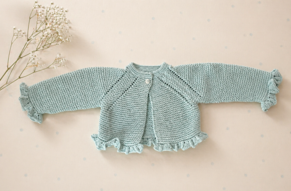 Rebeca volantitos tejida a mano. Disponible en varios colores tanto en algodón como en lana merino de máxima calidad.