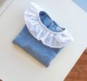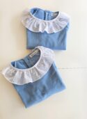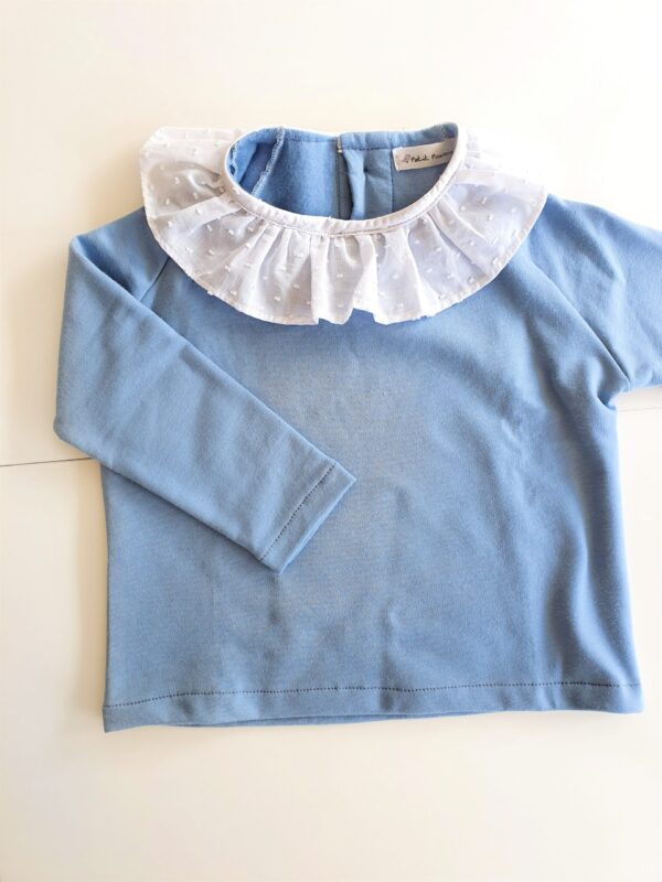 Sudadera lisa azul 100% algodón, forrada de tejido de pelito. Lleva cuello volante de plumeti blanco y abertura con botones en la parte trasera.