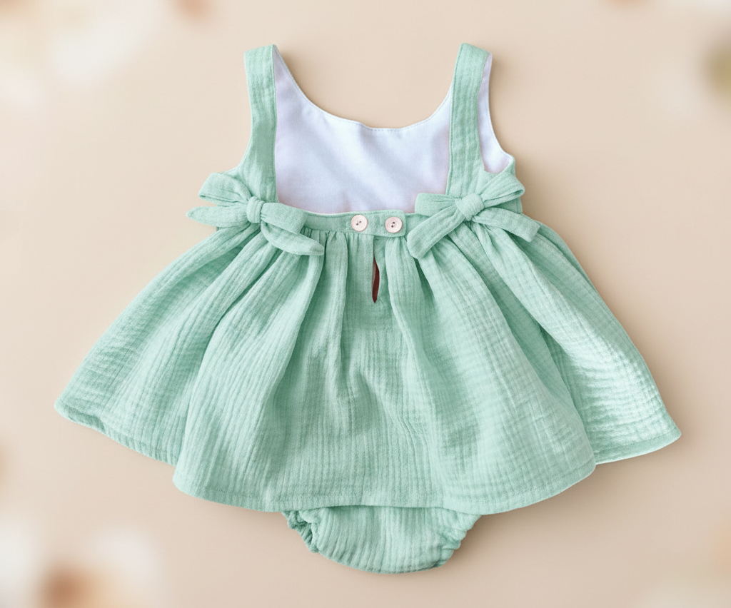 Vestido lacitos con la espalda abierta y cubrepañal a juego. 100% algodón.