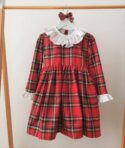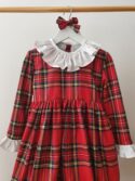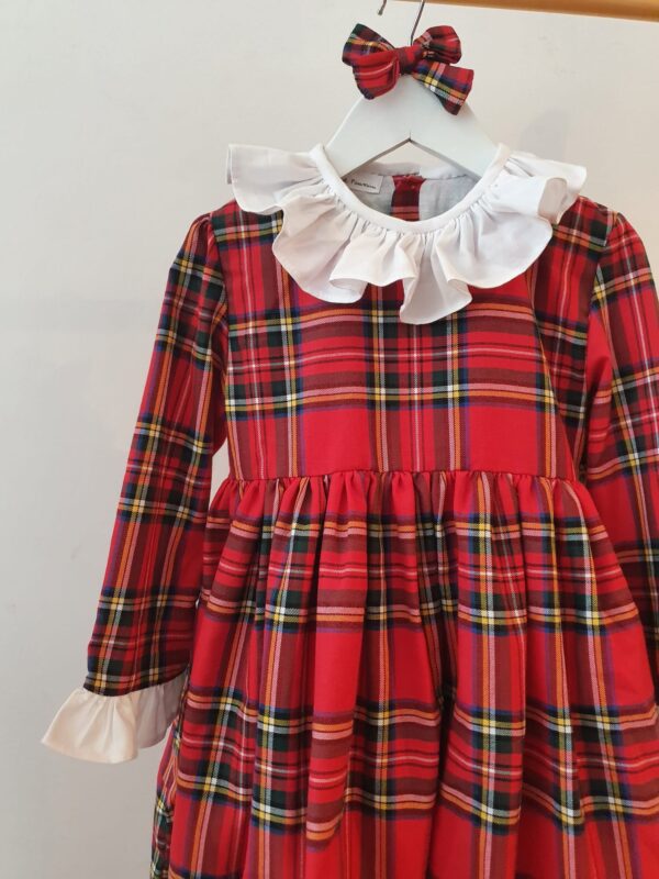 Vestido tartán rojo con cuello volante y mangas en algodón blanco.