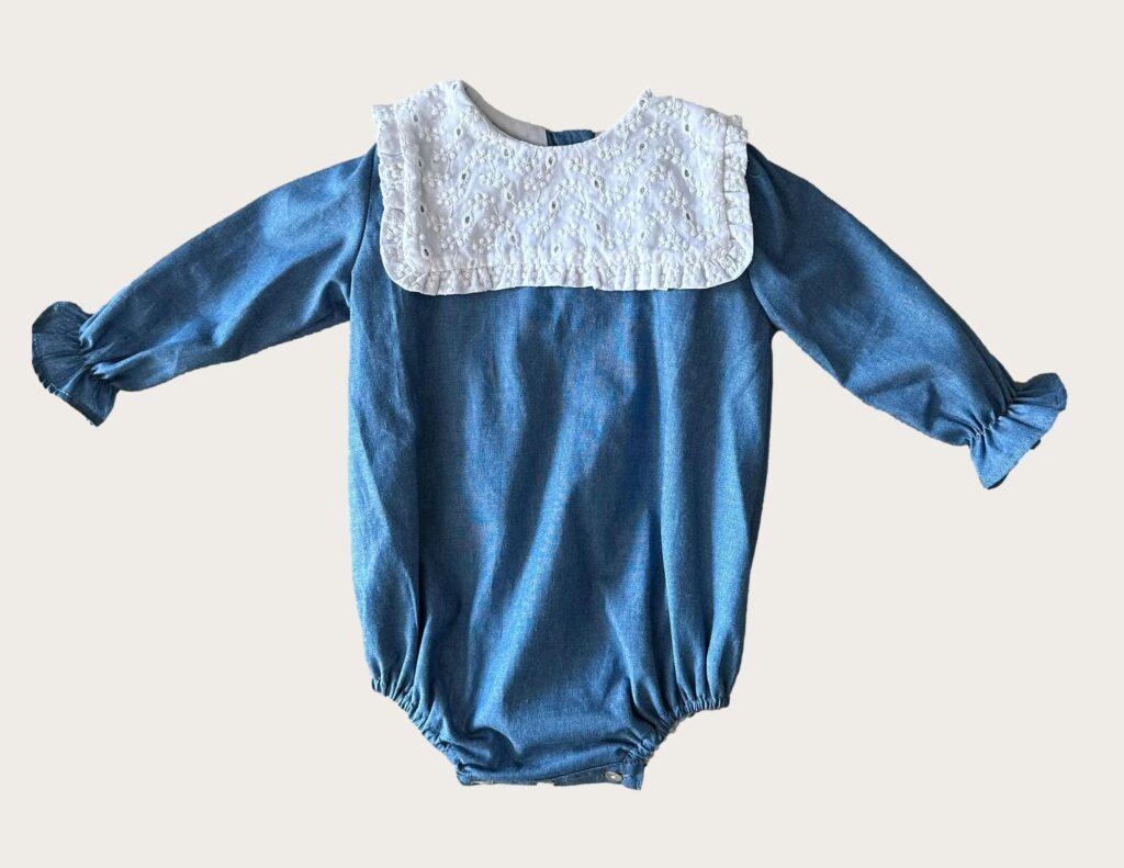 Ranita vichy florecitas con cuello volante y gomas en puños.