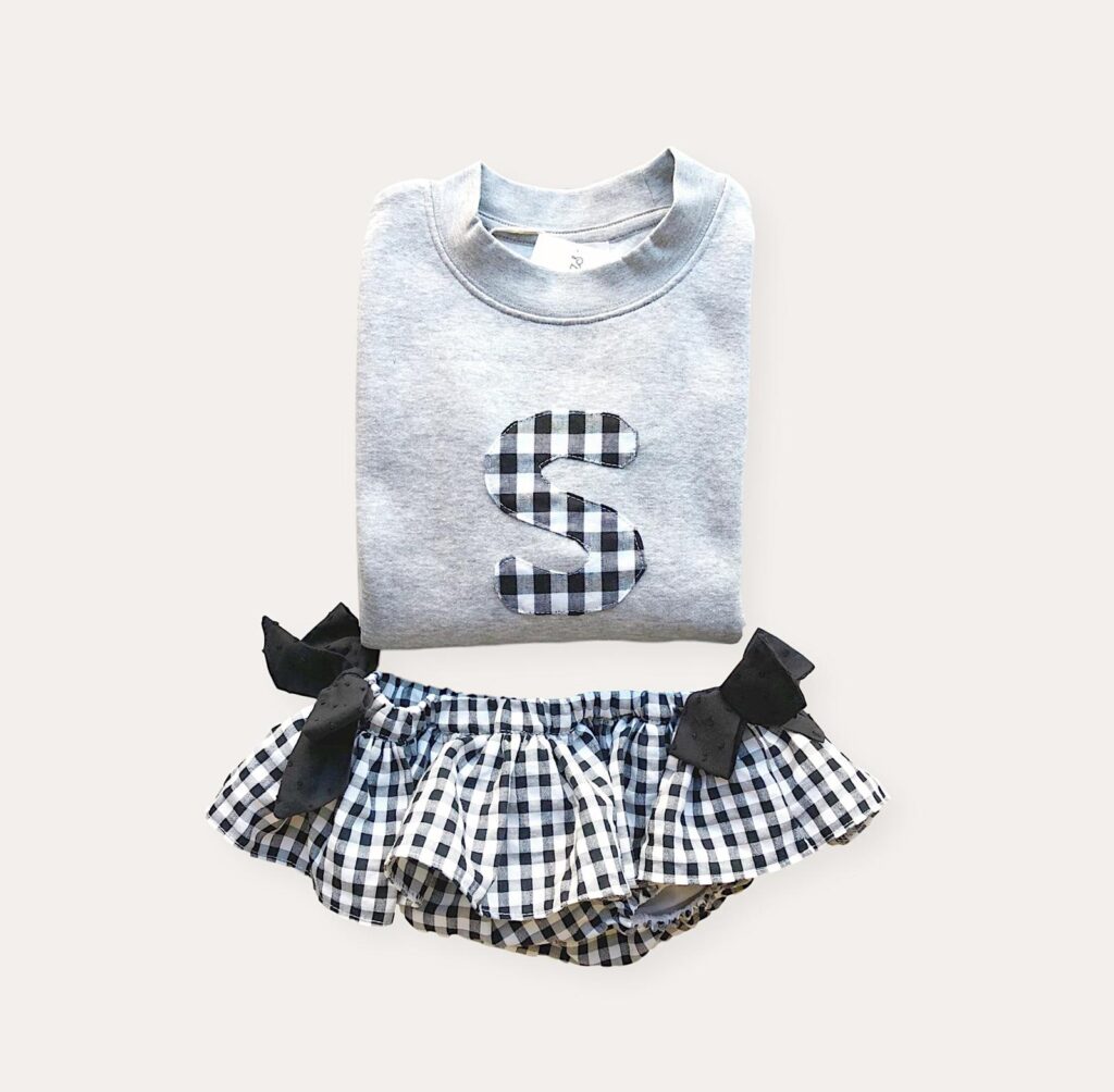 Sudadera gris adulto con la inicial personalizada en vichy negro. Por favor, escribe en "notas de pedido" al finalizar la compra la que desees.