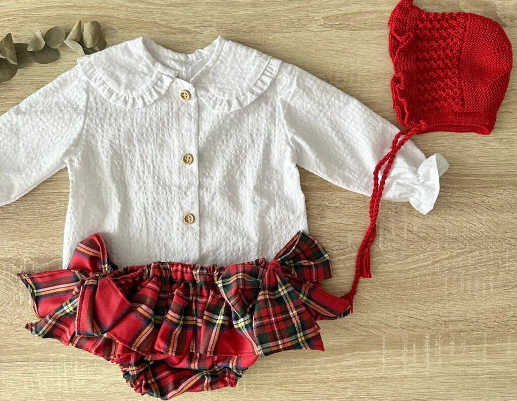 -Braguita tartán roja con volante y lacitos. Forro 100% algodón.